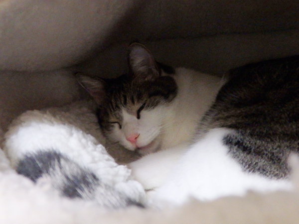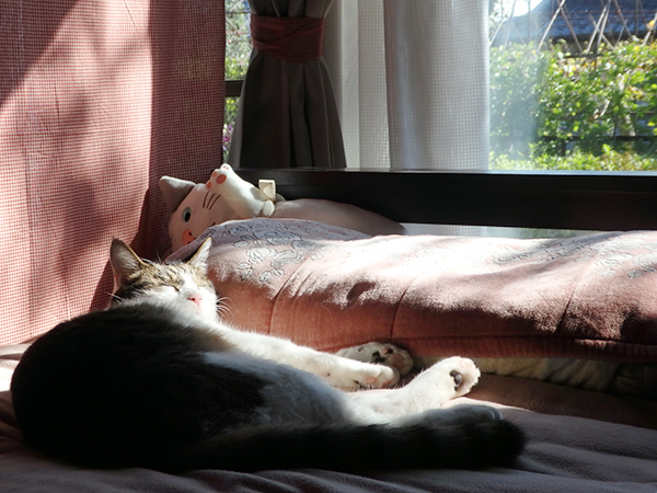 人間用ベッドや猫用ベッドで睡眠をむさぼるCEO 2016年10月22日 CEOのこと 少し前まで「お〜や〜つ〜」と鳴いていたのに、おやつをもらったら急に静かなCEO。静かな時はだいたい寝ているか、無心でいたずらしているかのどちらか。探しにいくと前者でした。人のベッドで枕を使ってぐっっっすり。 枕を使ってぐっすり スタッフの視線に気付いて、ごろり。 視線に気付いて おまたパカンでぐっすり。 くっはー 睡眠をむさぼりたいだけむさぼるCEO。 むさぼるCEO 夜になって気温が下がってくると今度はどら焼き型ベッドの中にインしてみる。 どら焼きの中に おめめ、お口半開きでまたしてもぐっすり寝ているCEOなのでした。うらやまし〜! おめめ、お口半開き