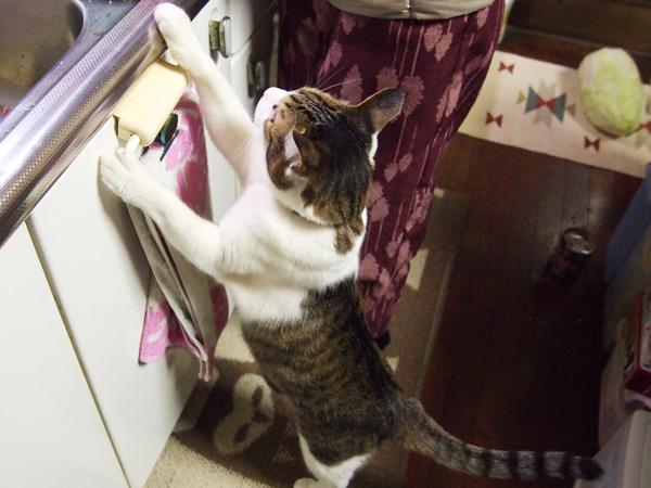 毎回必死すぎる表情が笑える、CEOのご飯タイム 2015年3月25日 CEOのこと 夕方17:00少し前から「ギャバー!ギャバー!」と胆が絡んだ鳴き声で夕食タイムを知らせてくれるCEO。この日も絶賛おねだり中。 おねだり中のCEO シンクに前足をかけて一生懸命に猫缶の香りを嗅いでおります。にしてもホントでかいな・・。少し小さめな中型犬サイズはあろうかと。あ、モンペとか後ろに写っている白菜とかお気になさらず・・。 でかいなぁ・・ 缶詰の香りを嗅がせてもらうのですが、毎回必至すぎる表情に笑わずにはいられません。食いしん坊すぎて困ってしまうスッタフなのでした。 必至すぎて・・笑